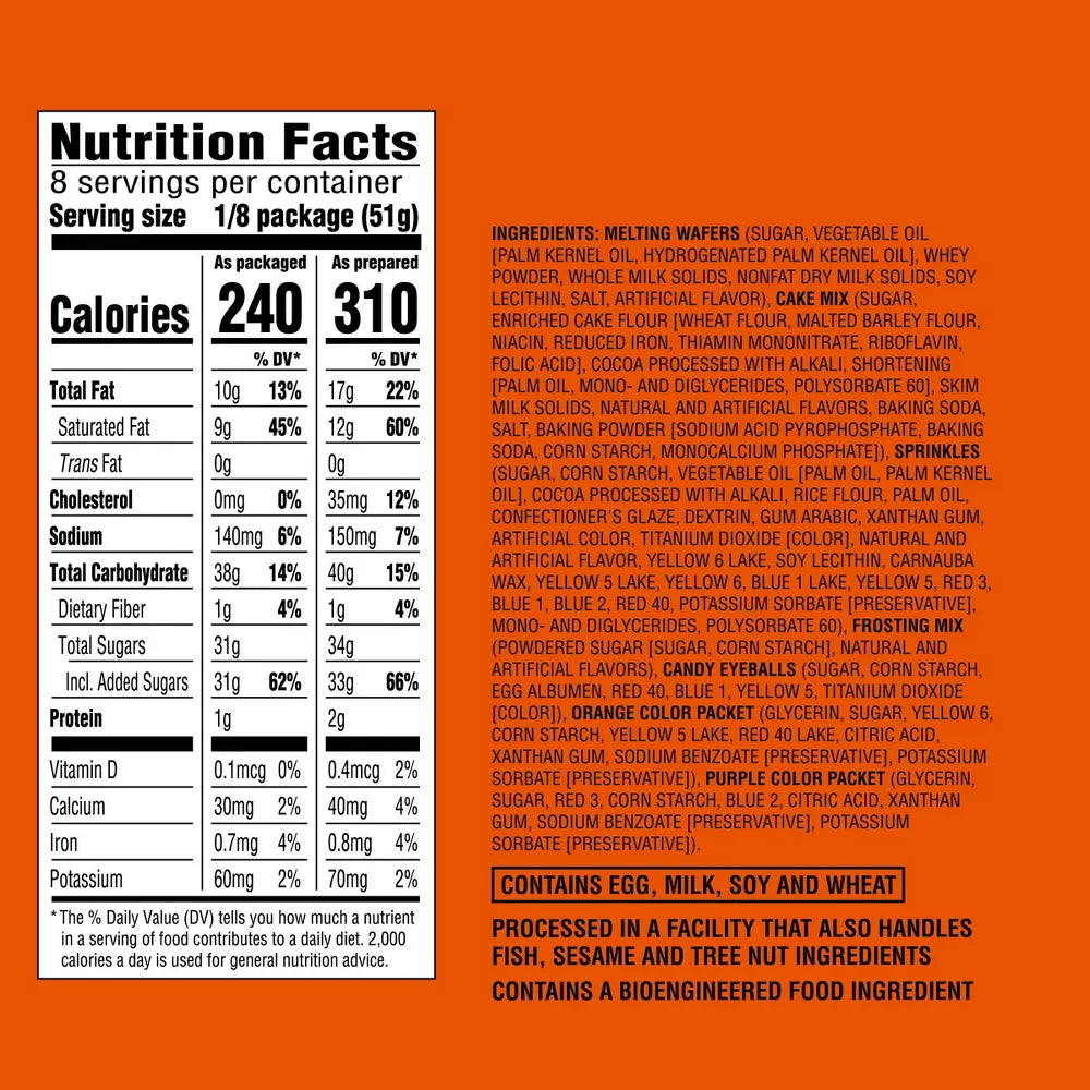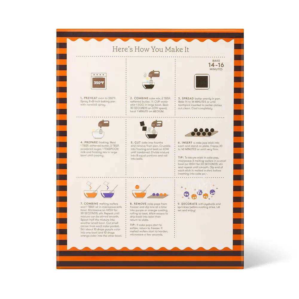 Incluye mezcla para pastel de chocolate, mezcla para glaseado, ojos de caramelo, mezcla para chispas, obleas para derretir, palitos para cake pops, sobres de color naranja y morado