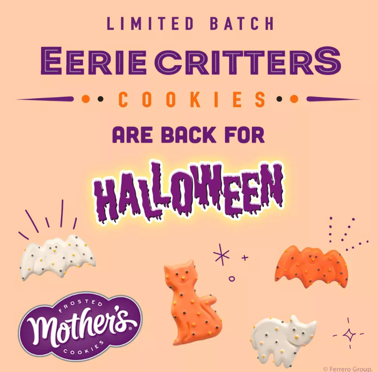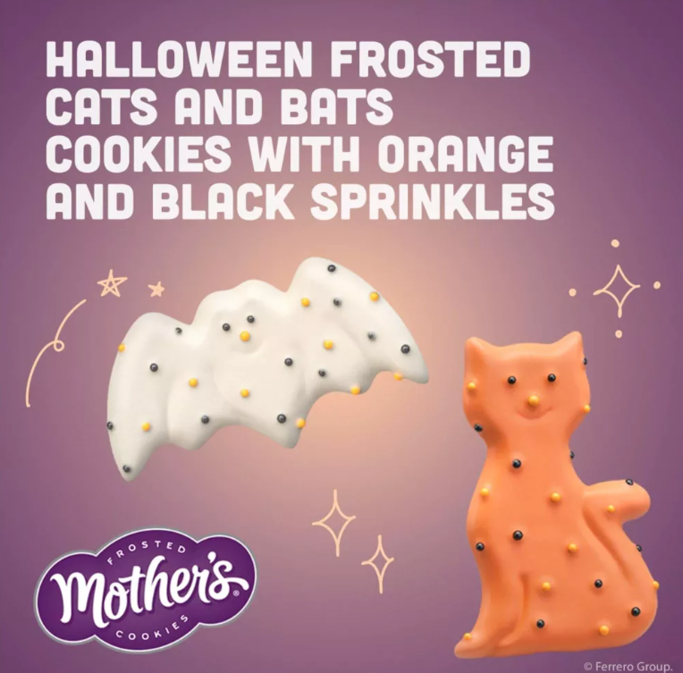 GLASA SABROSA: Las galletas de Halloween de Mother's no contienen jarabe de maíz de alta fructosa y están cubiertas de glasa naranja y blanca con chispas negras y naranjas.